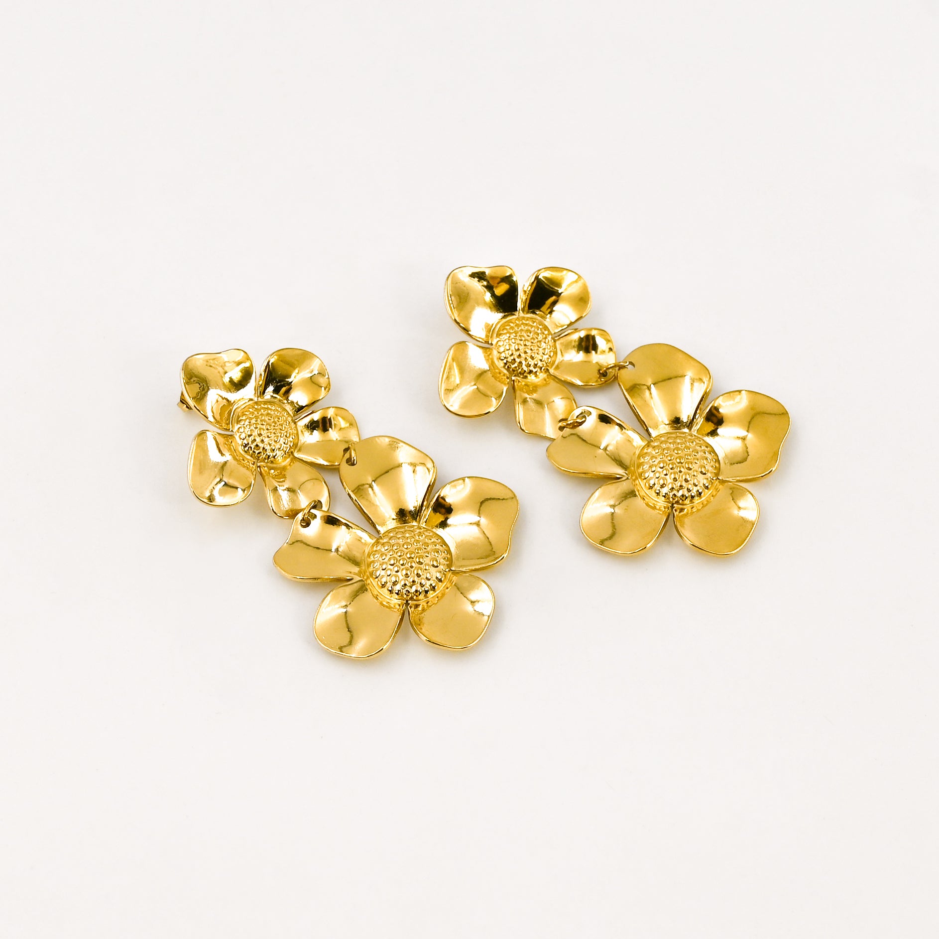 • Boucles d'oreilles pendantes composées de deux fleurs, en acier inoxydable