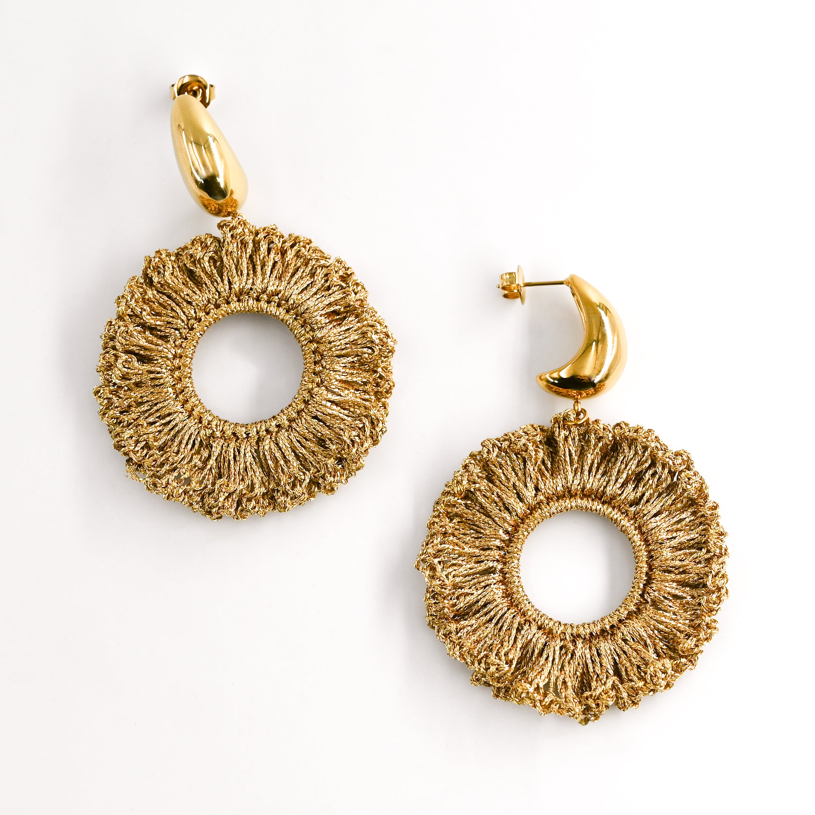 • Boucles d'oreilles pendantes composées d'un empiècement doré et d'un empiècement en fils métallisés dorés, en acier inoxydable