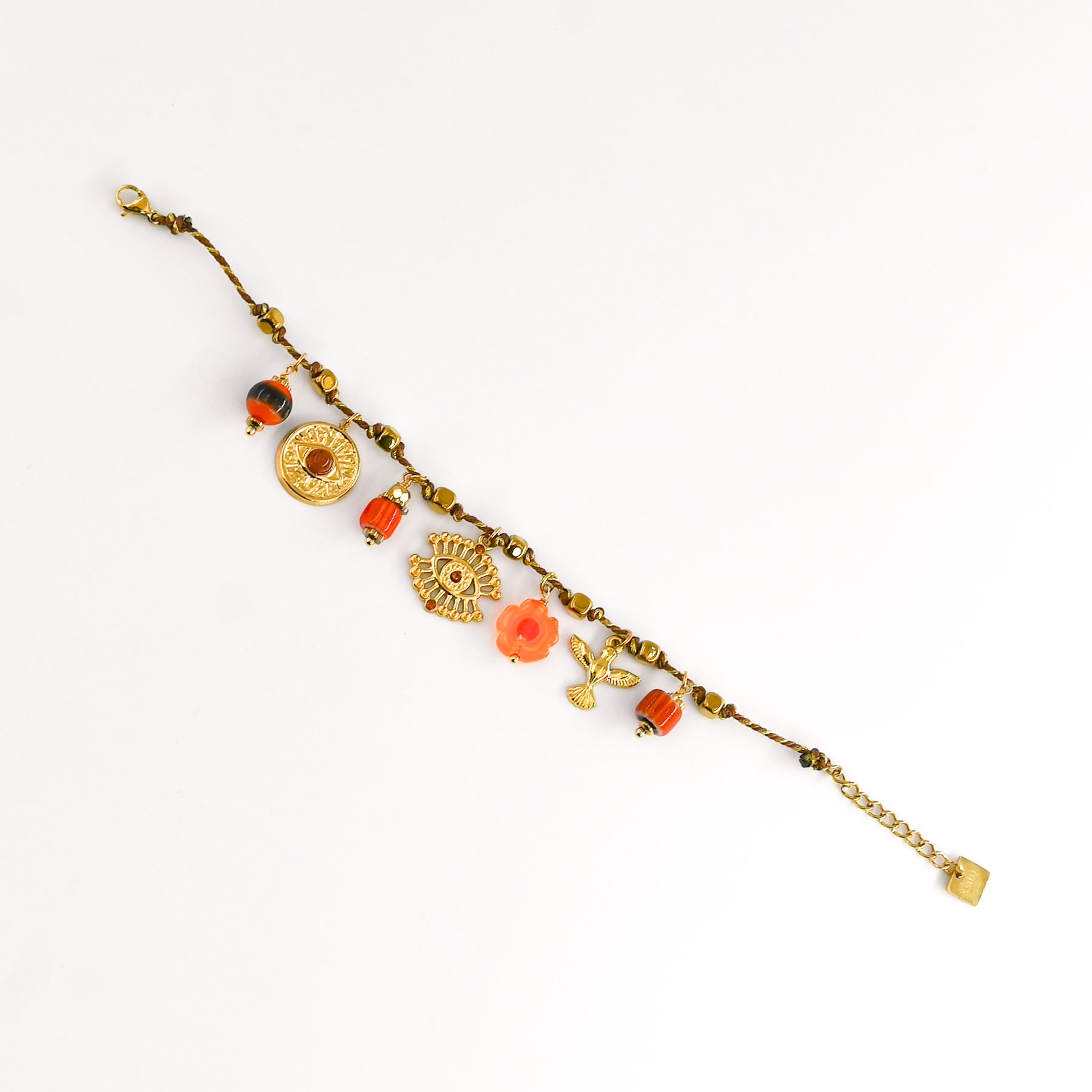 • Bracelet cordon marron composé de charm's dorés et oranges