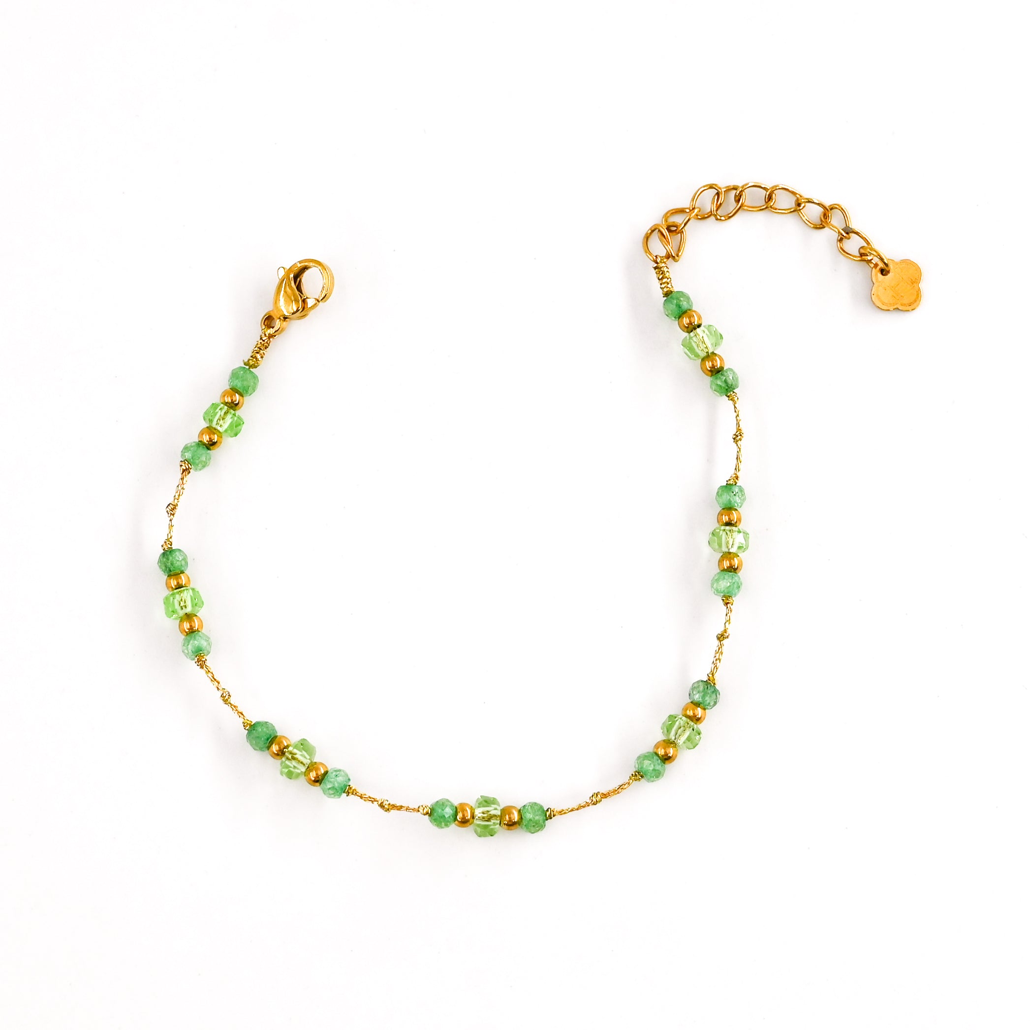 • Bracelet cordon métallisé doré composé de petites perles vertes et dorées