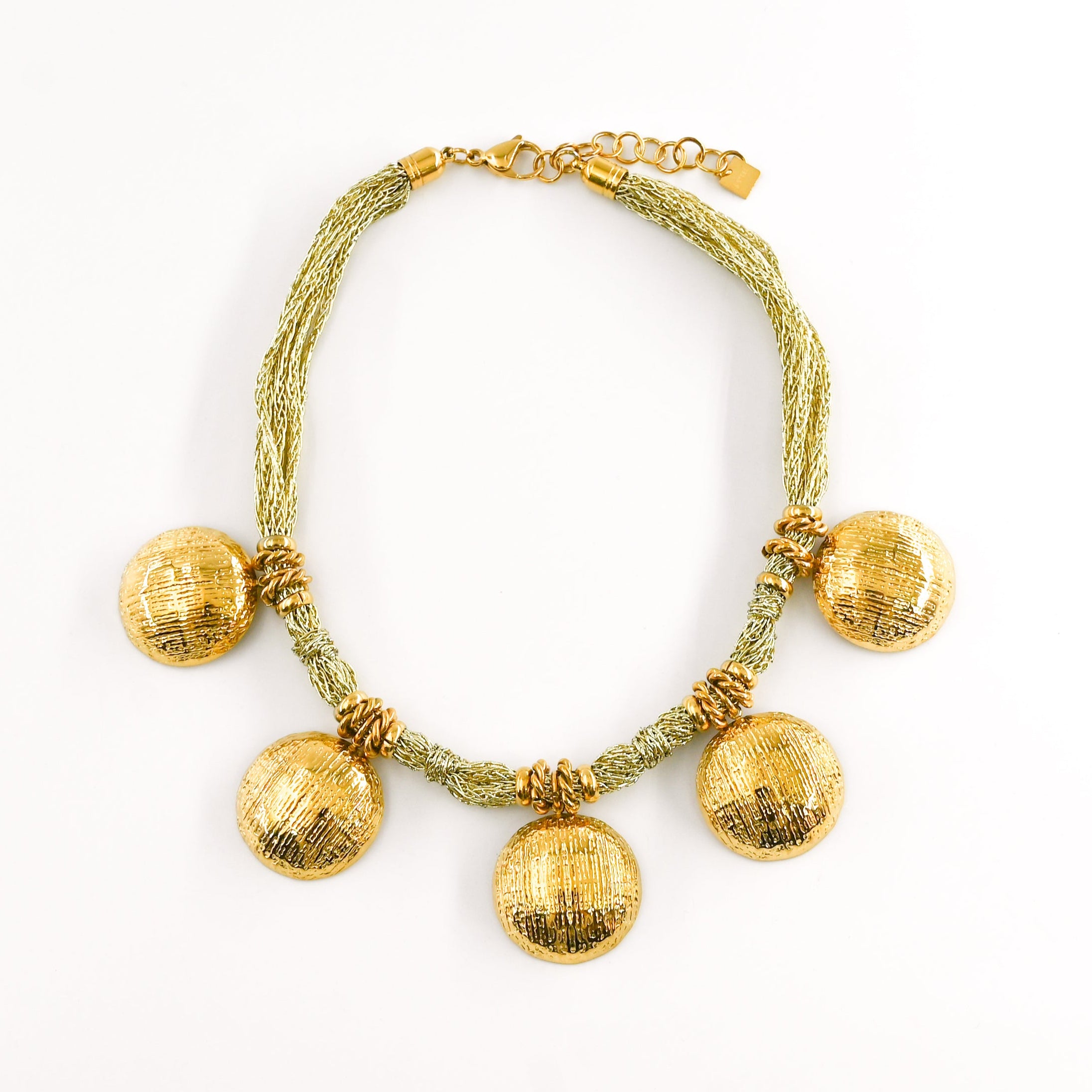 • Collier cordon métallisé doré composé de cinq pendentifs ronds martelés dorés, en acier inoxydable