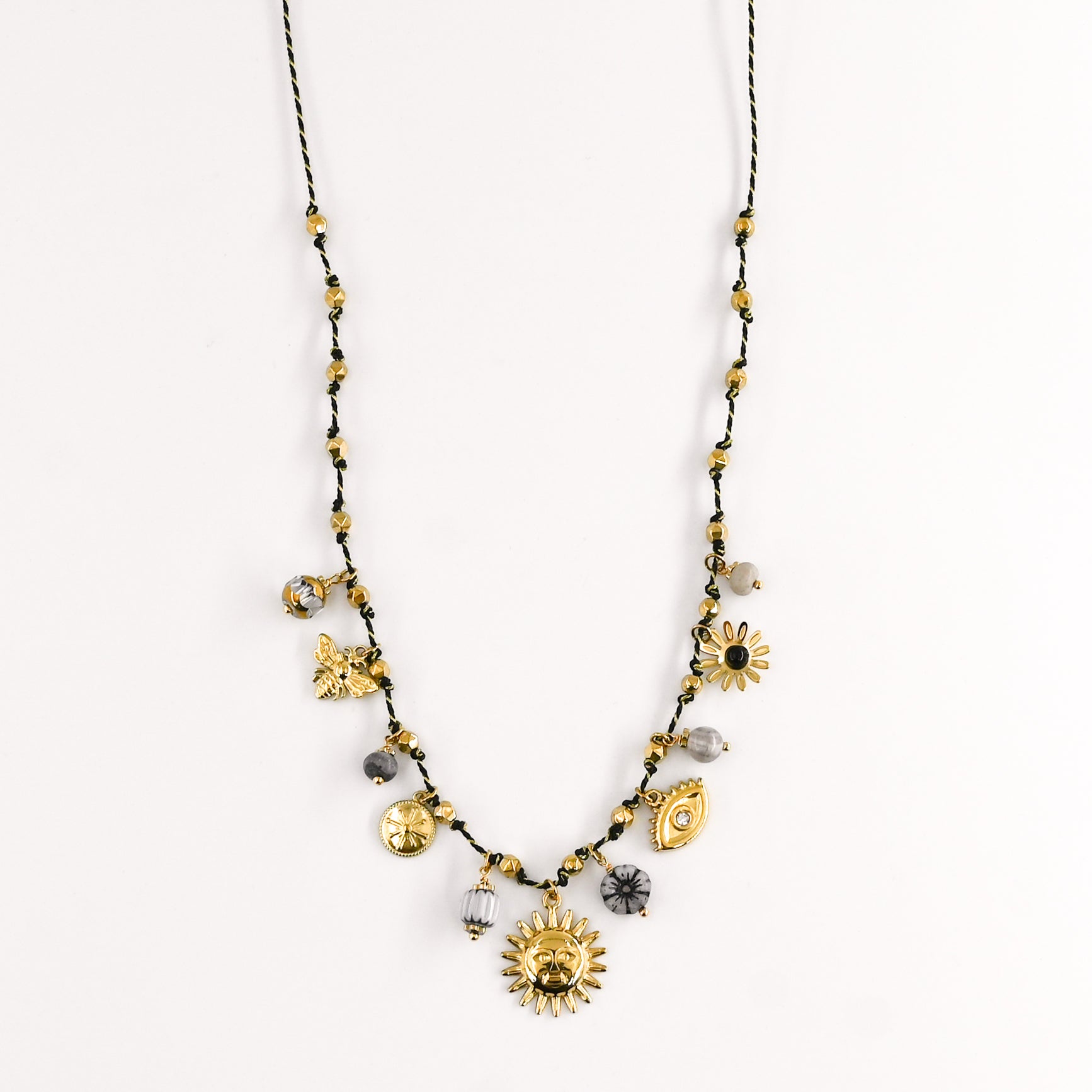 • Collier cordon noir et doré composé de charm's dorés et gris