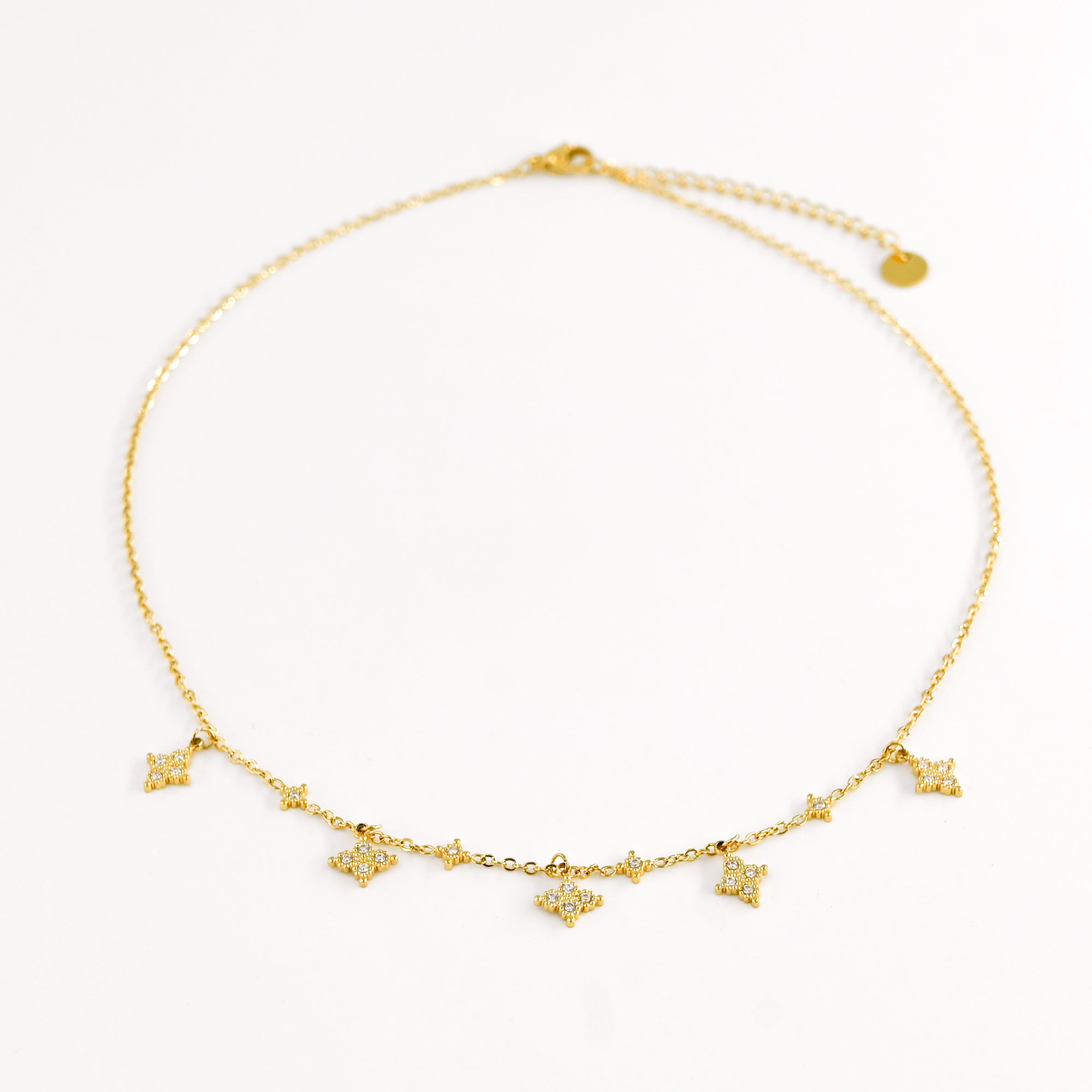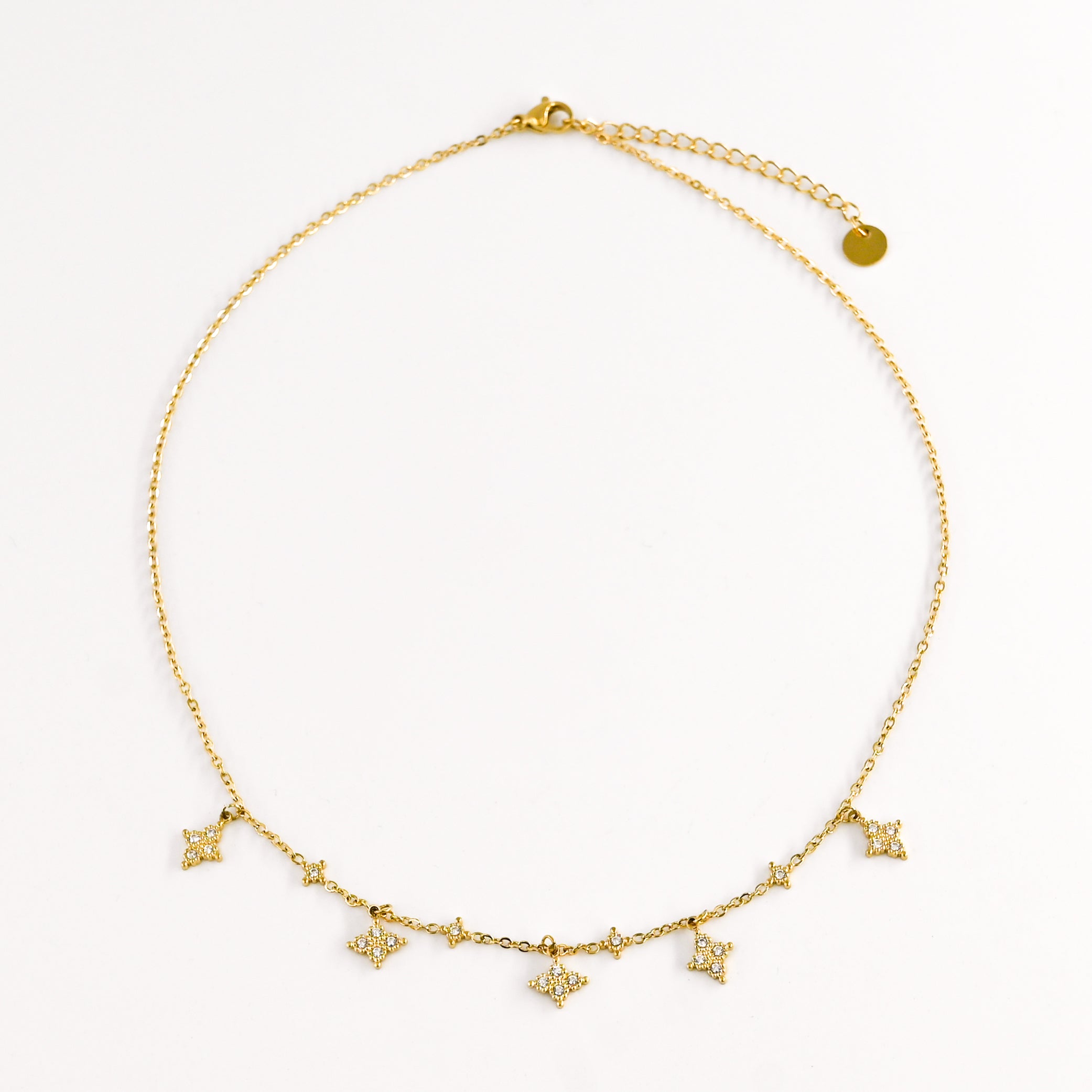 • Collier fin composé de petites pampilles étoiles ornées de strass blancs, en acier inoxydable