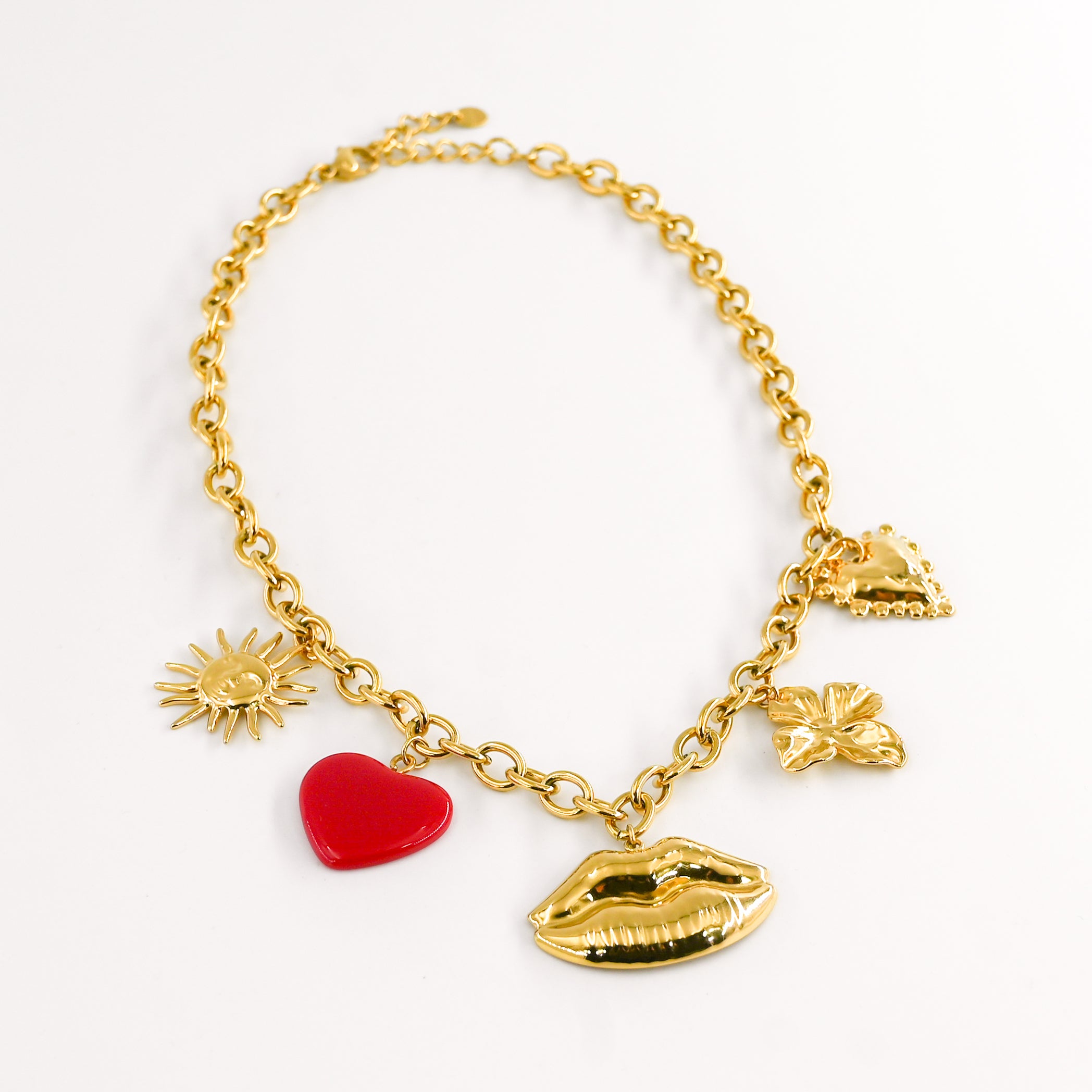 • Collier maille composé de charm's dorés et d'un coeur rouge, en acier inoxydable