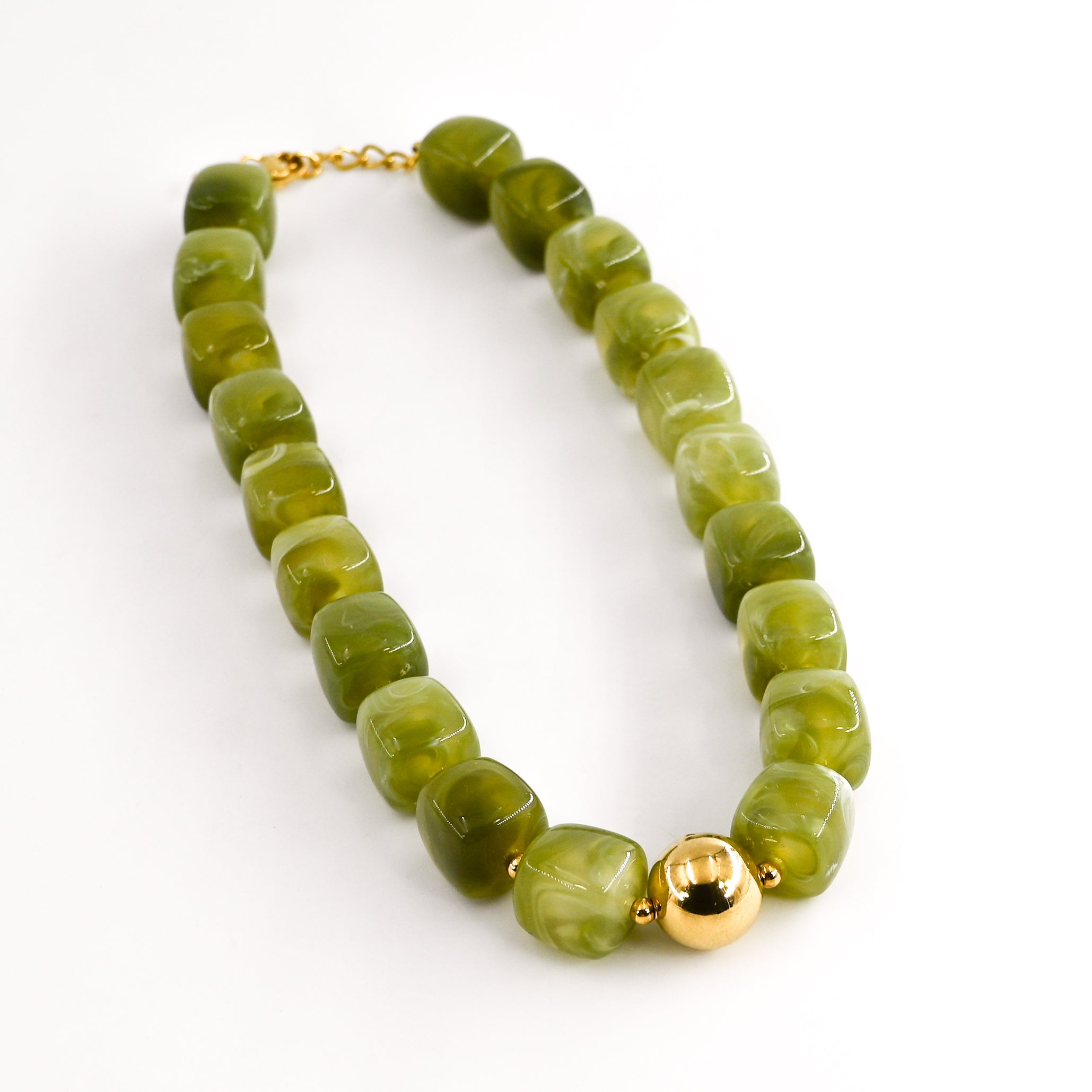 • Collier composé de perles vert olive et d'une perle centrale dorée