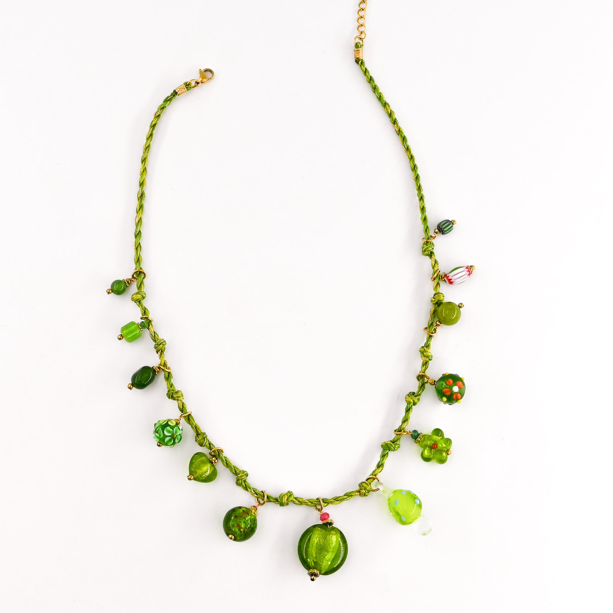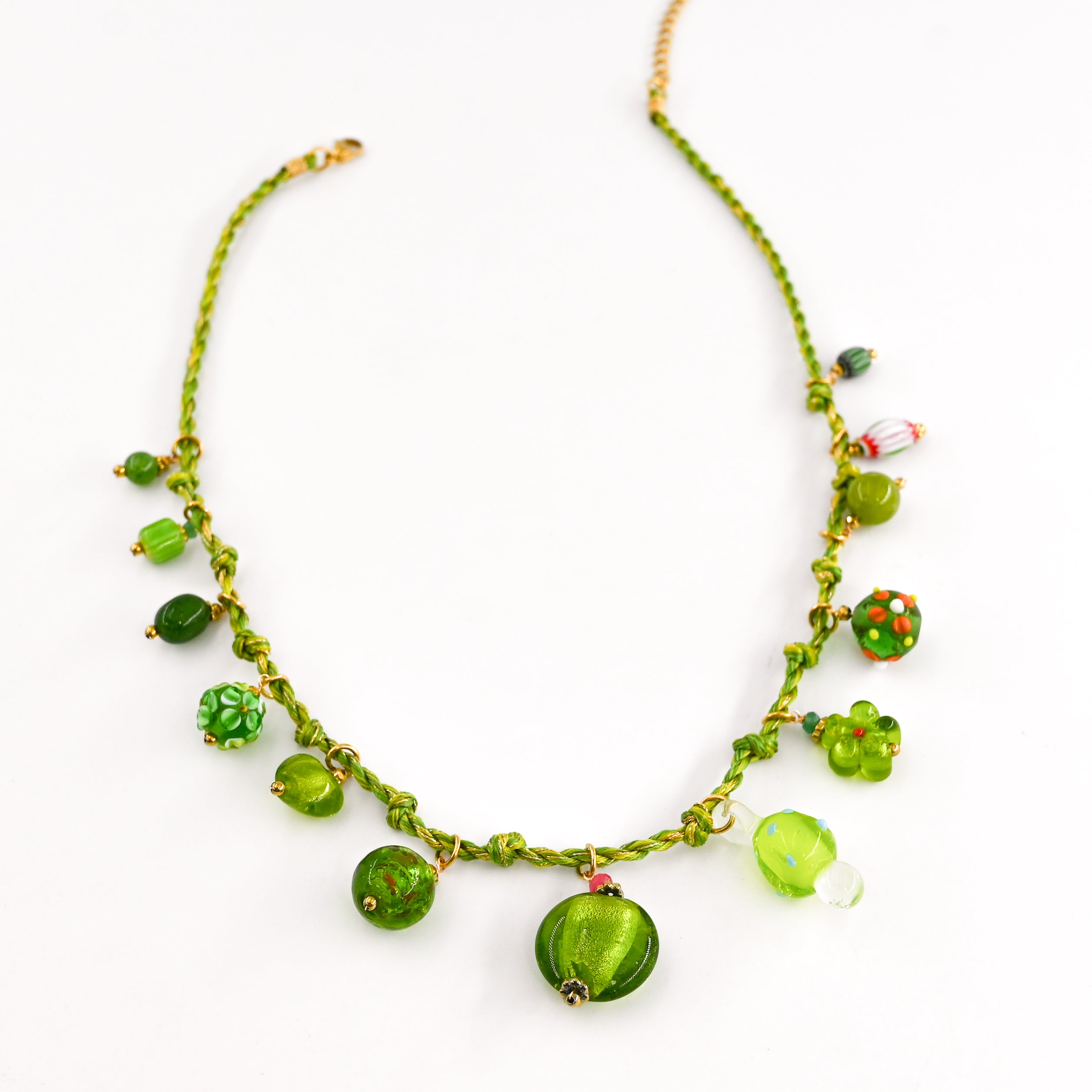 • Collier composé d'un cordon vert et de fils métallisés dorés entrelacés et de grands charm's perles vertes