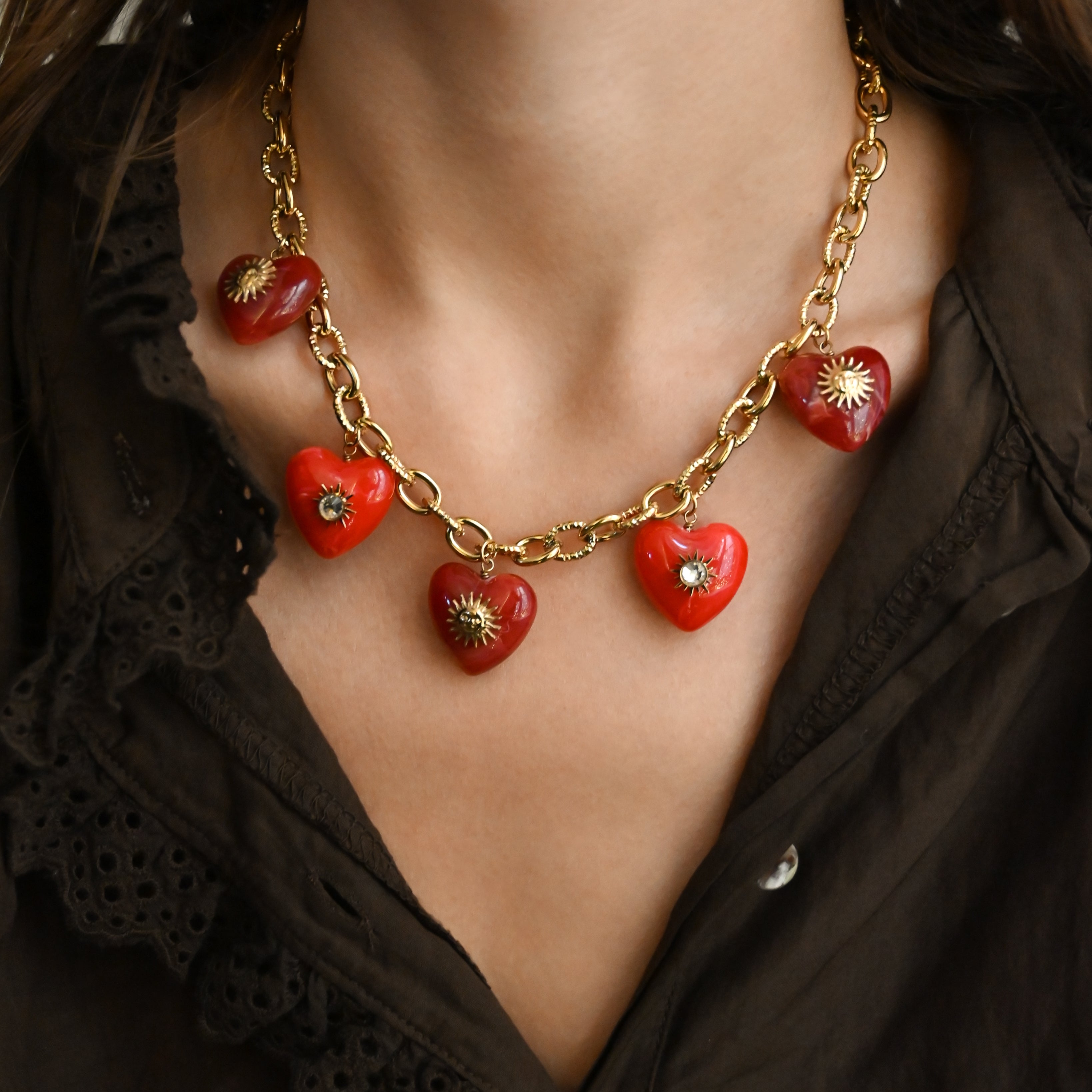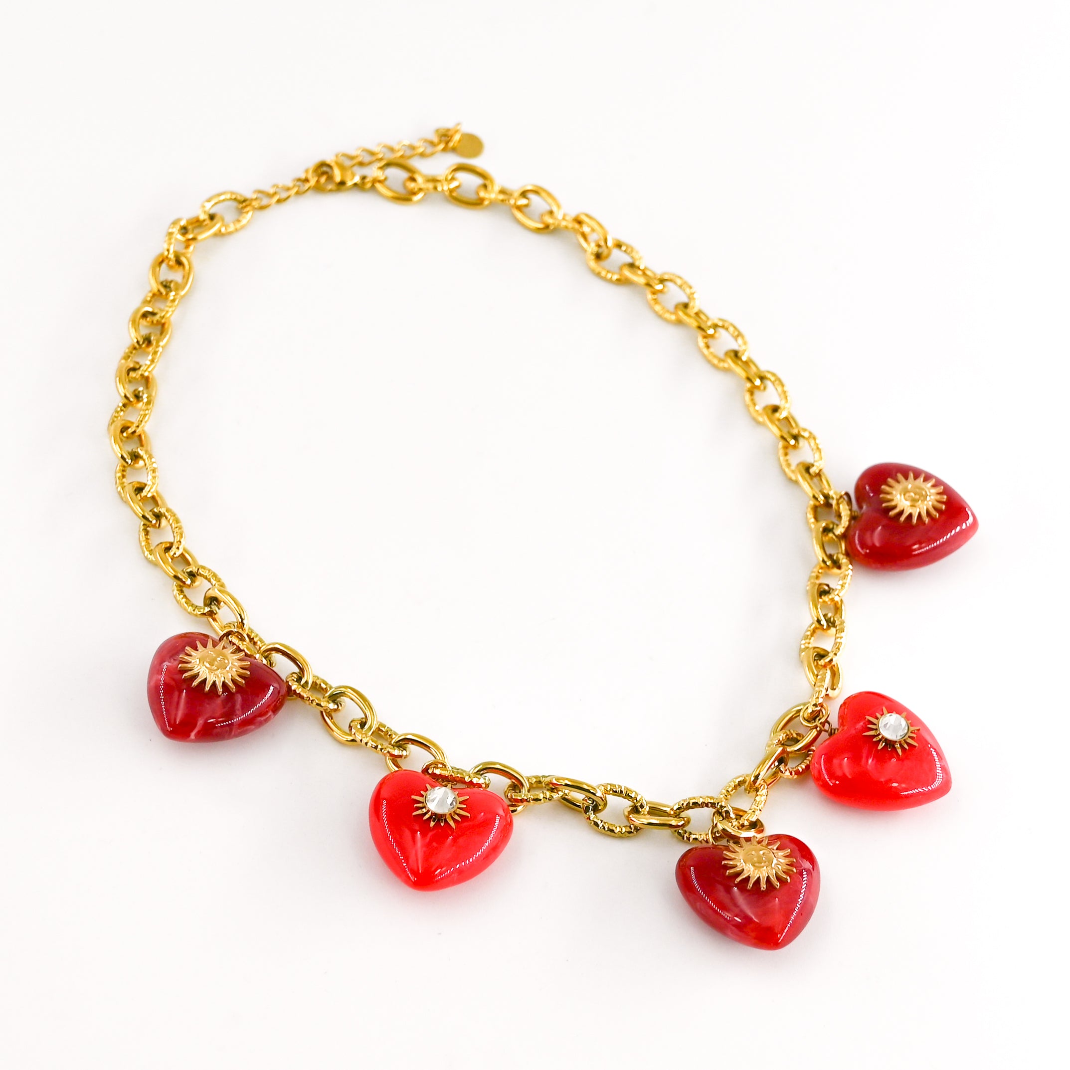 • Collier maille composé de pendentifs coeurs rouges ornés de petits soleils dorés et d'un strass blanc, en acier inoxydable