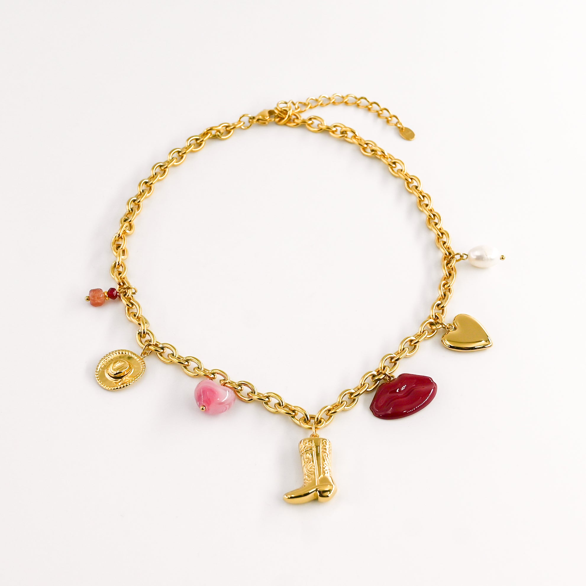 • Collier maille composé de charm's dorés, roses et rouges, en acier inoxydable