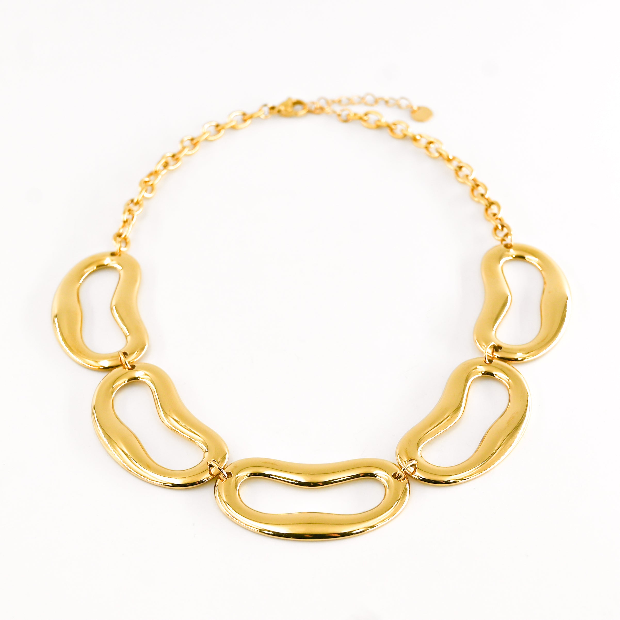 • Collier maille composé d'empiècements dorés ajourés, en acier inoxydable