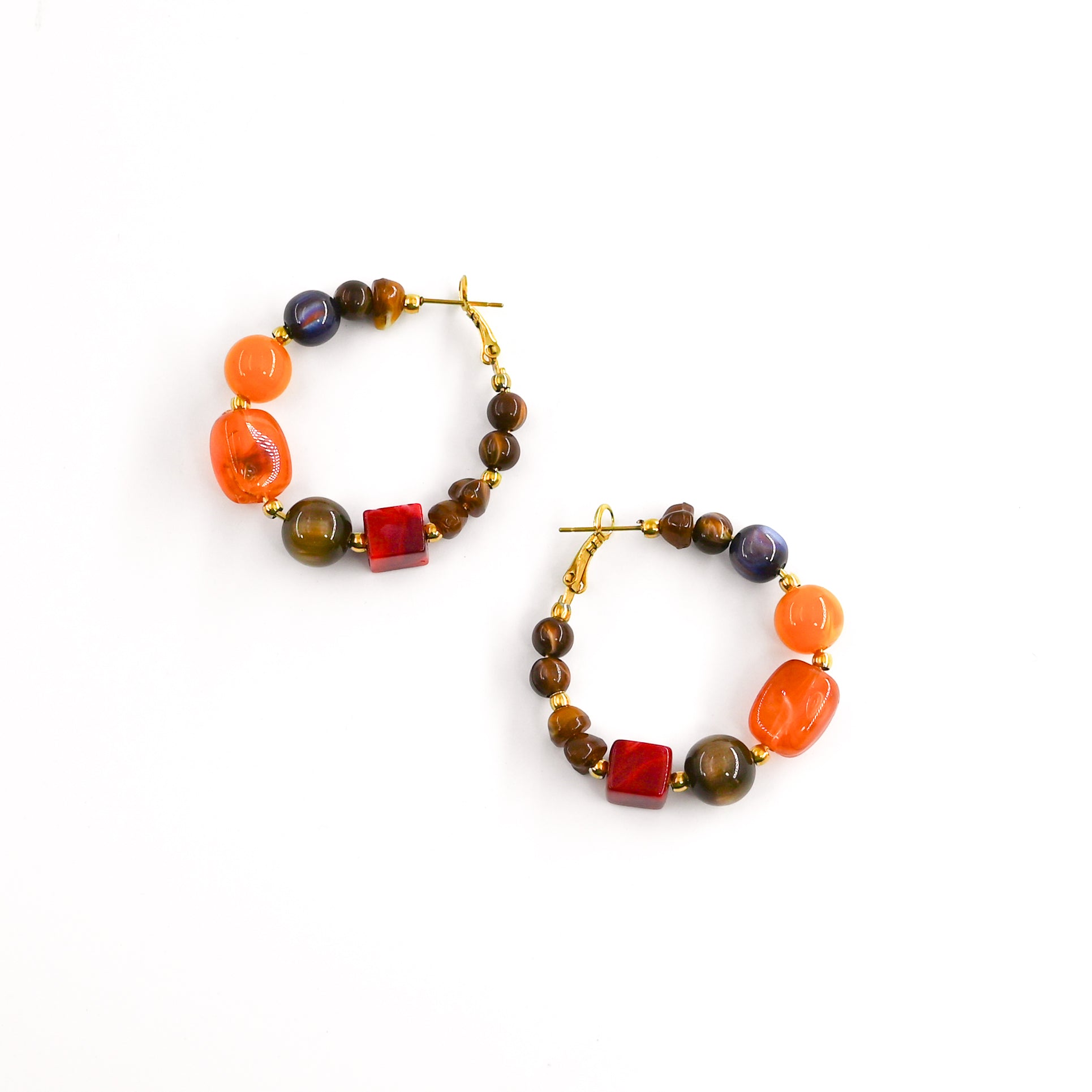 • Créoles rondes composées de grandes perles géométriques colorées