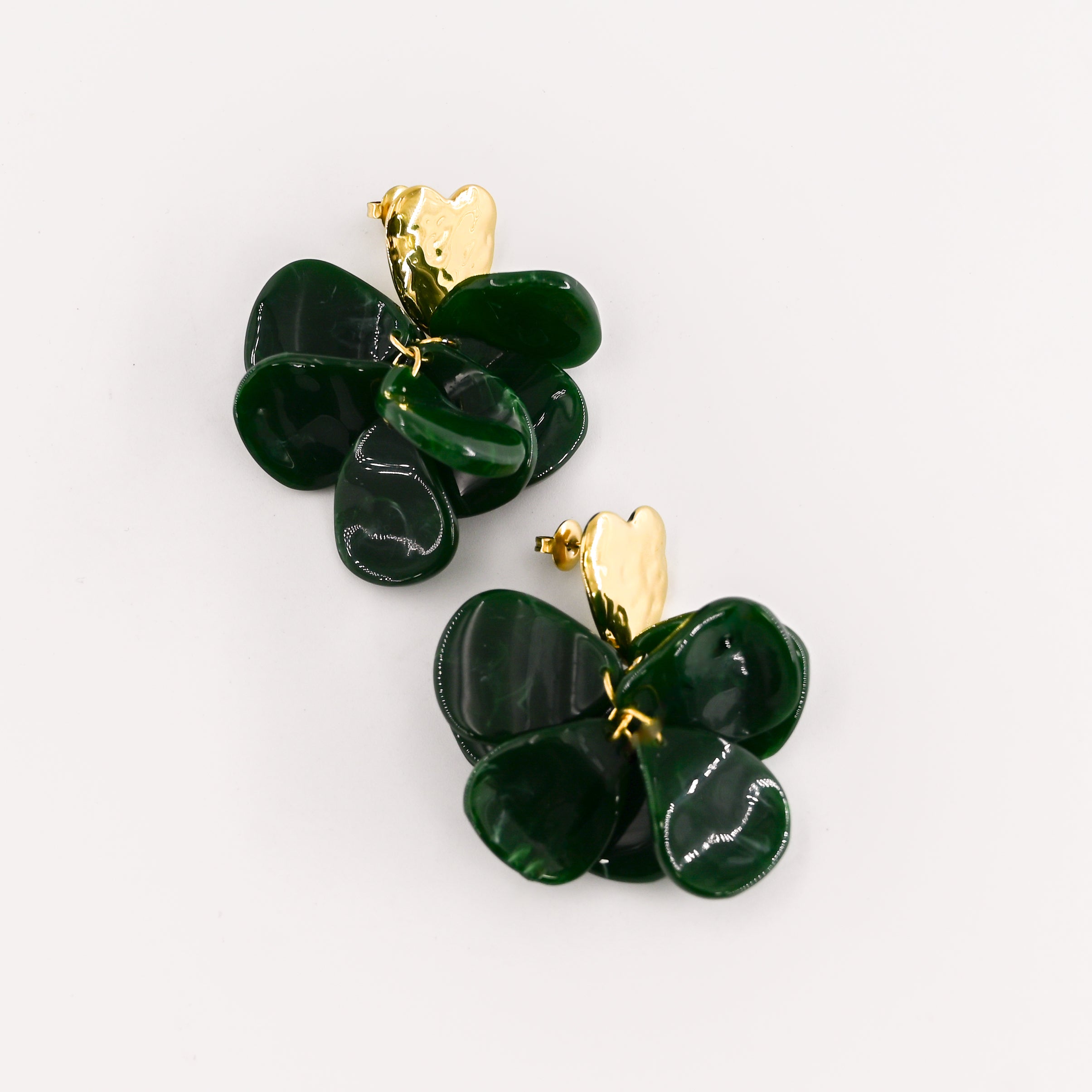 • Boucles d'oreilles pendantes fleurs composées d'un empiècement martelé doré et de pétales vertes en acrylique