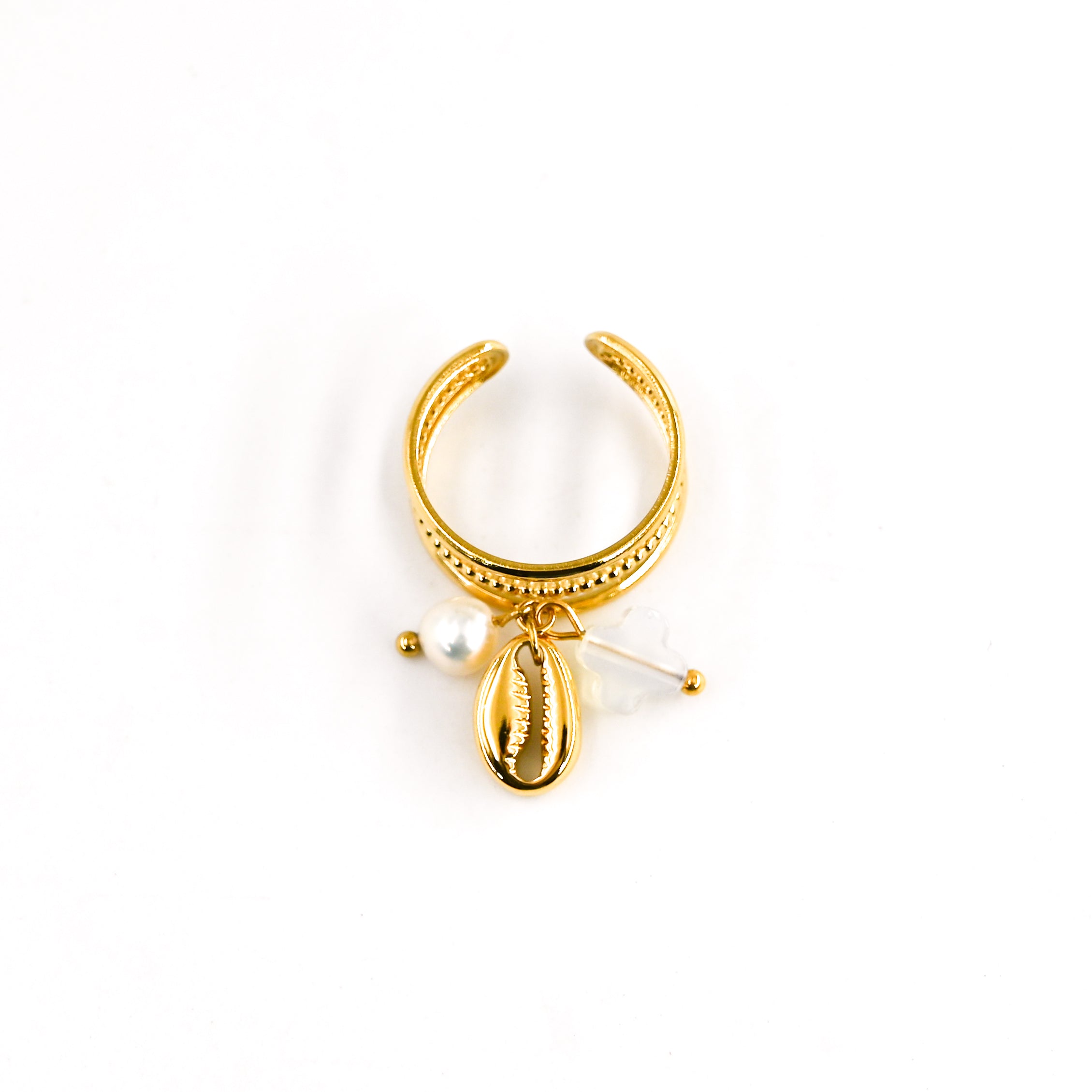 • Bague multi rangs composée d'un coquillage, d'une perle blanche et d'un trèfle en jade blanc, en acier inoxydable