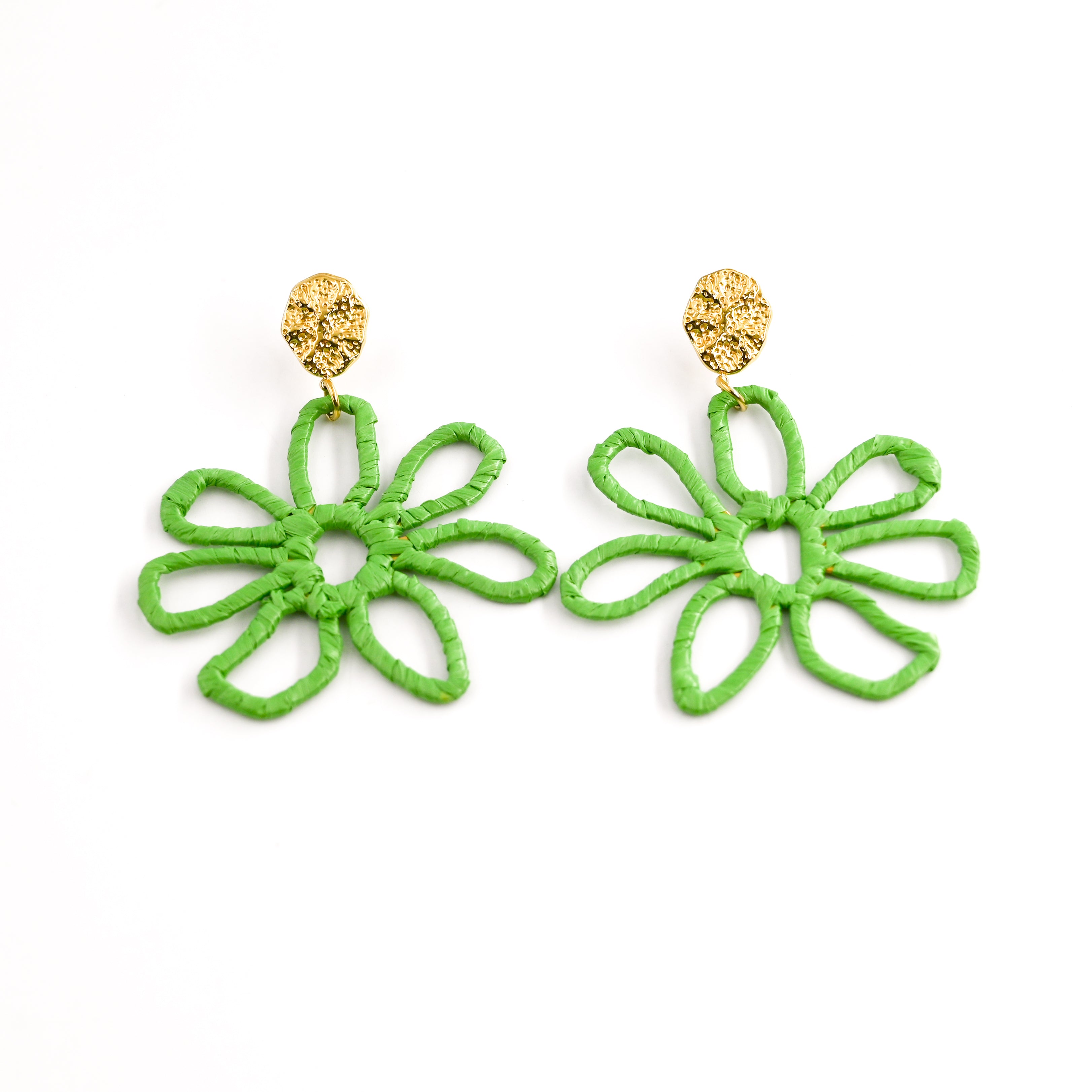• Boucles d'oreilles composées d'un empiècement doré martelé et d'un pendentif fleur en raphia vert, en acier inoxydable
