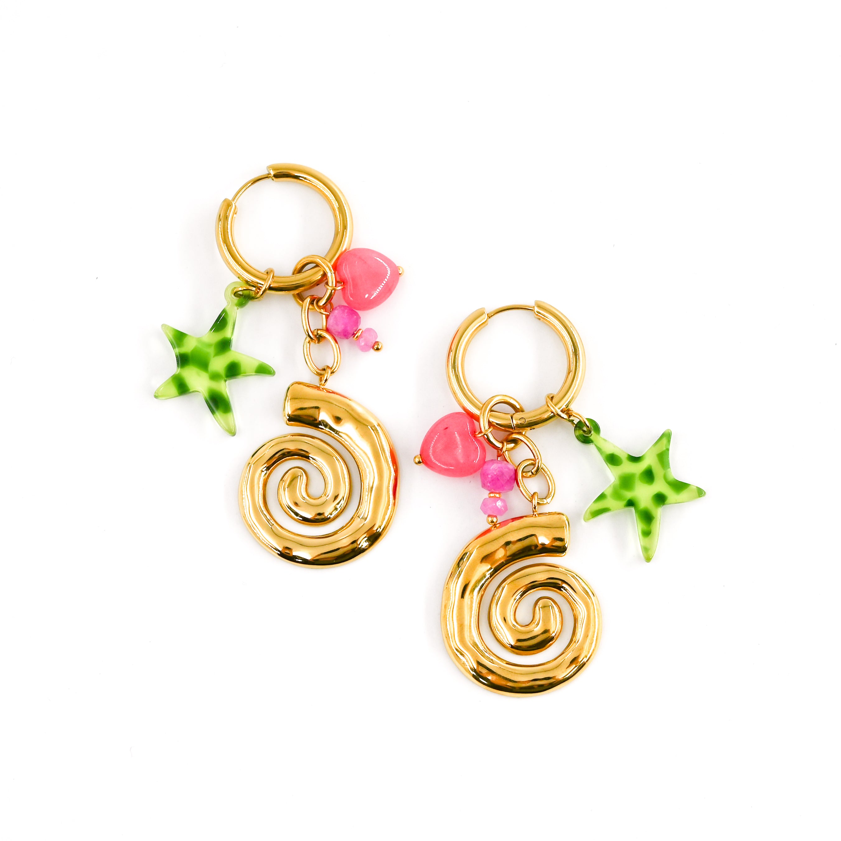 • Boucles d'oreilles créoles composées d'un pendentif coquillage et de perles colorées, en acier inoxydable