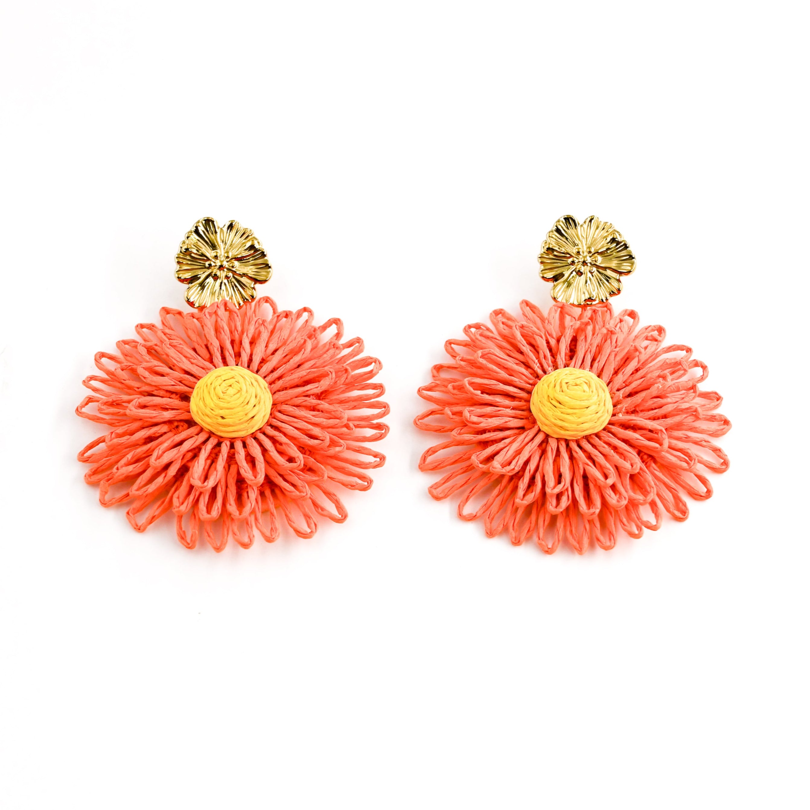 • Boucles d'oreilles composées d'une grande fleur en raphia orange