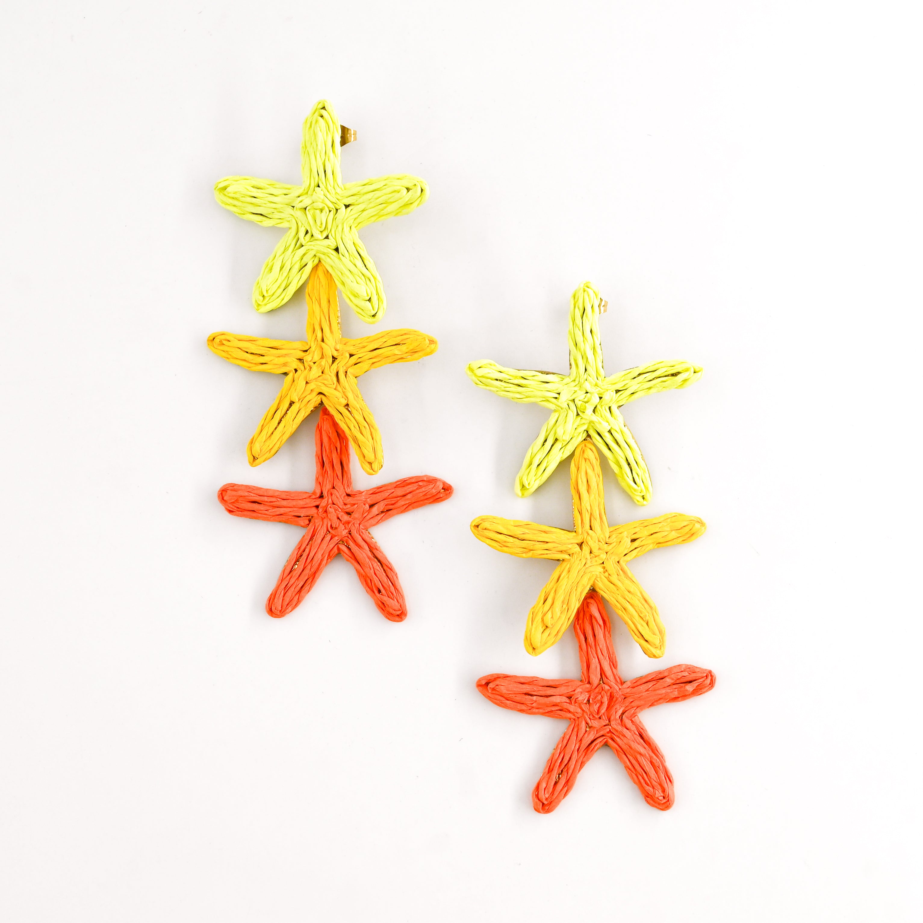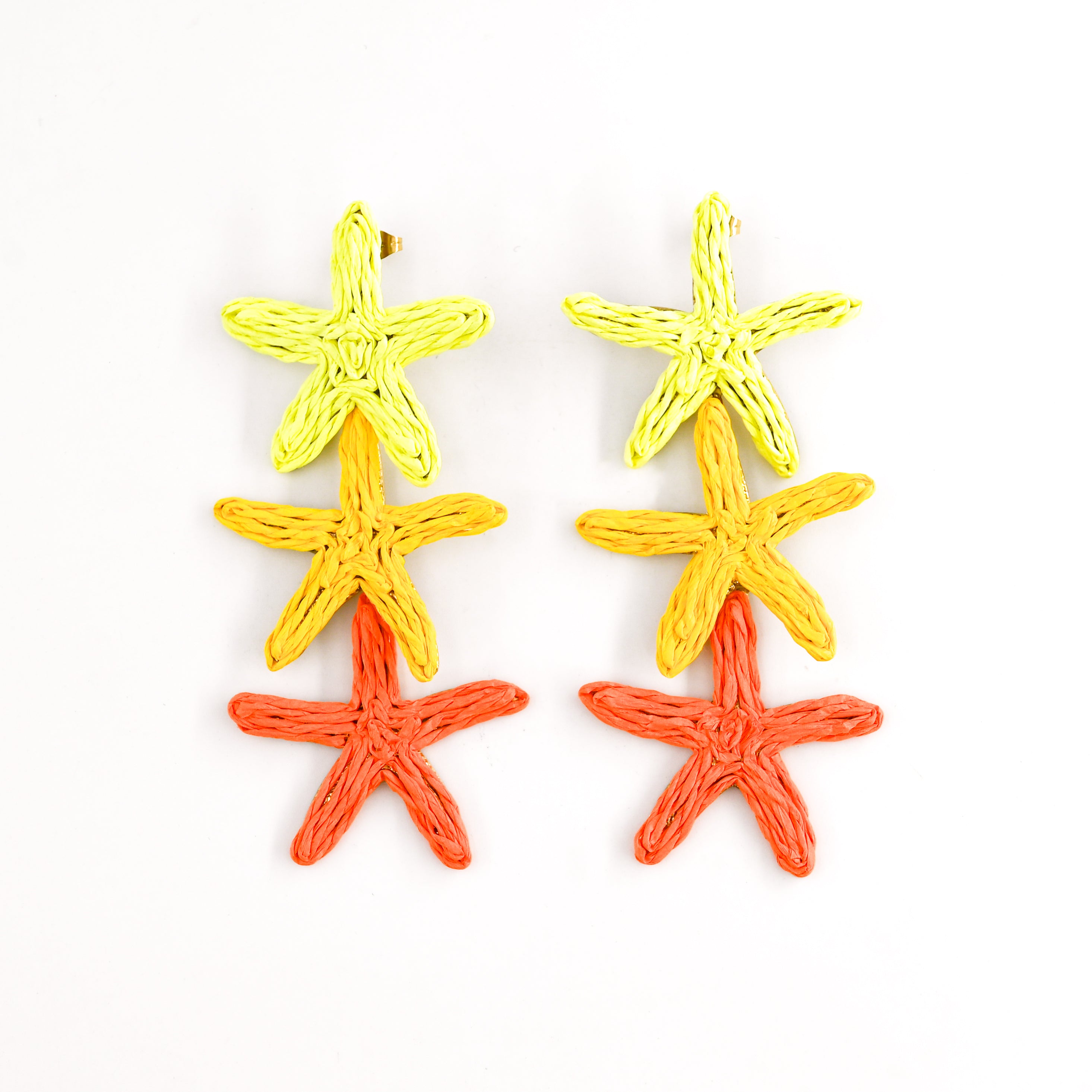 • Boucles d'oreilles pendantes composées de trois étoiles de mer en raphia jaune et orange, en acier inoxydable