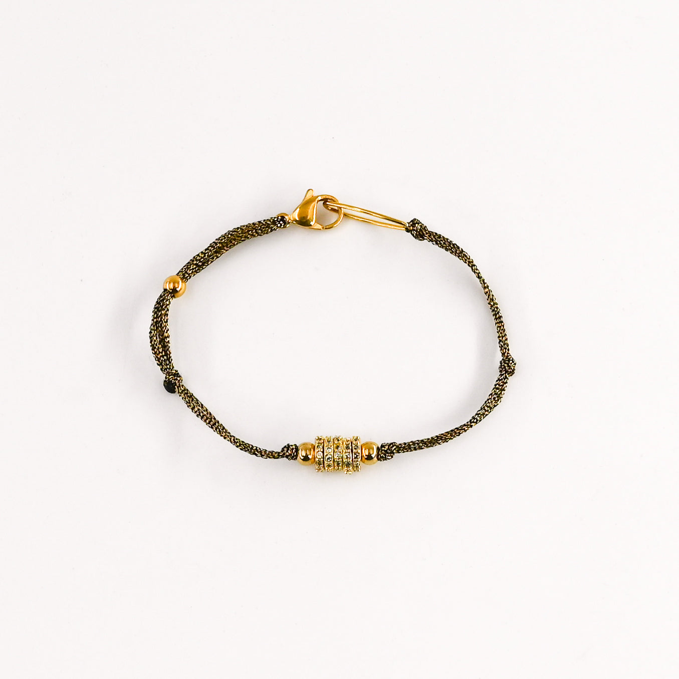 • Bracelet composé d'un cordon marron et fils métallisés et d'une amulette ornée de petits strass blancs