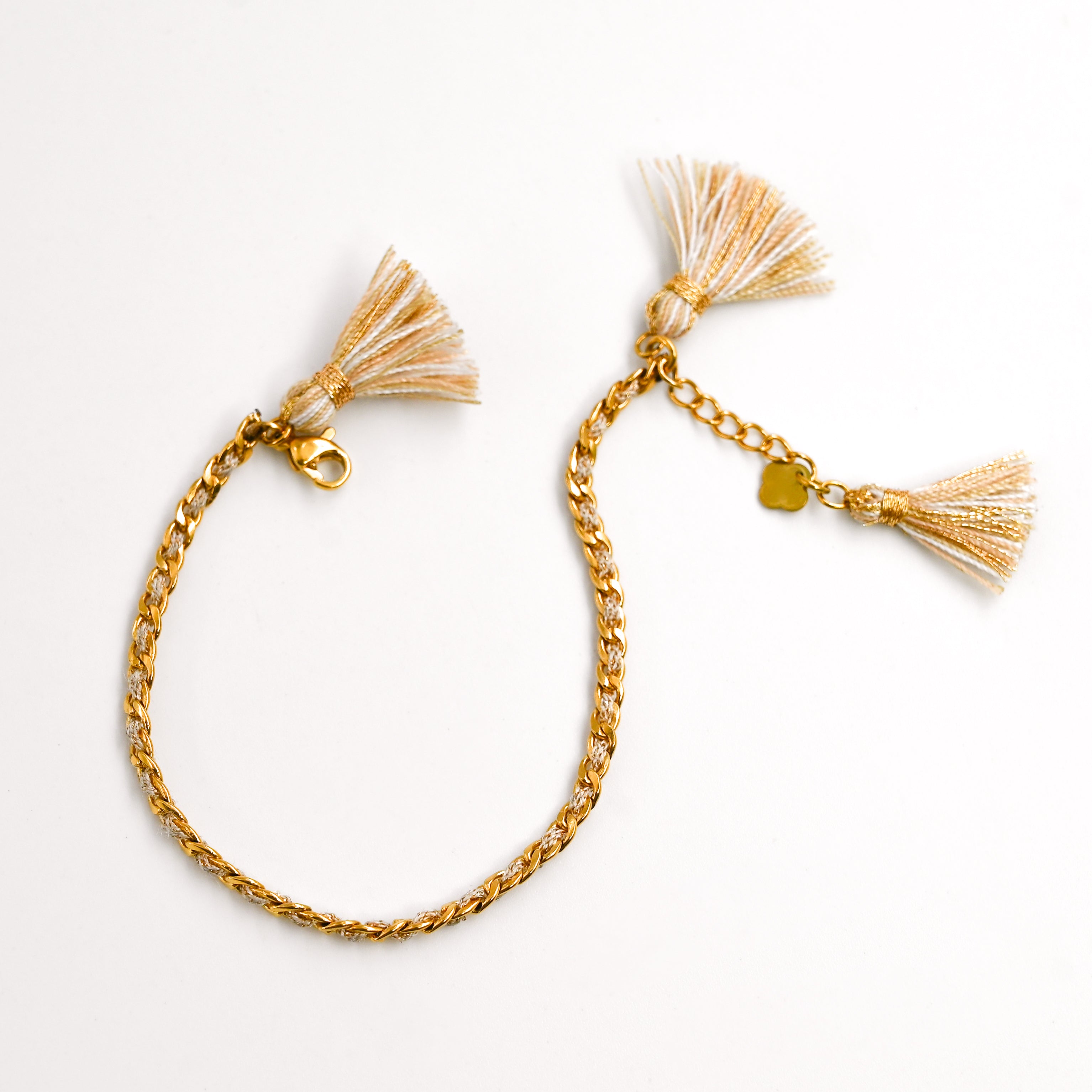 • Bracelet composé d'une maille et d'un cordon entrelacés et de trois pompons en tissu, en acier inoxydable