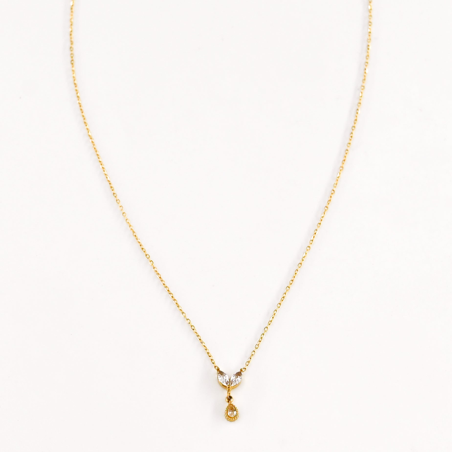 • Collier fin composé de deux pétales et un pendant strass, en acier inoxydable