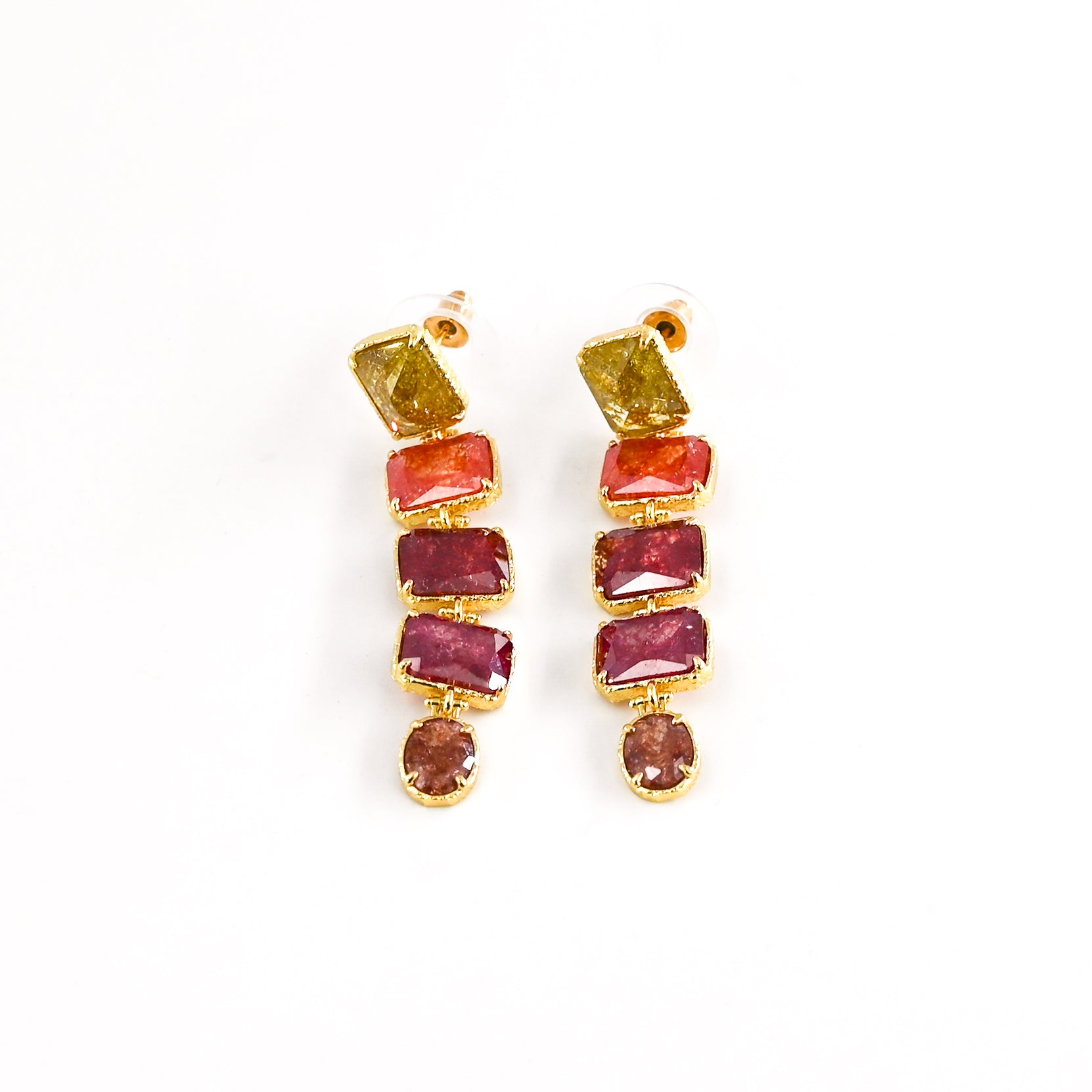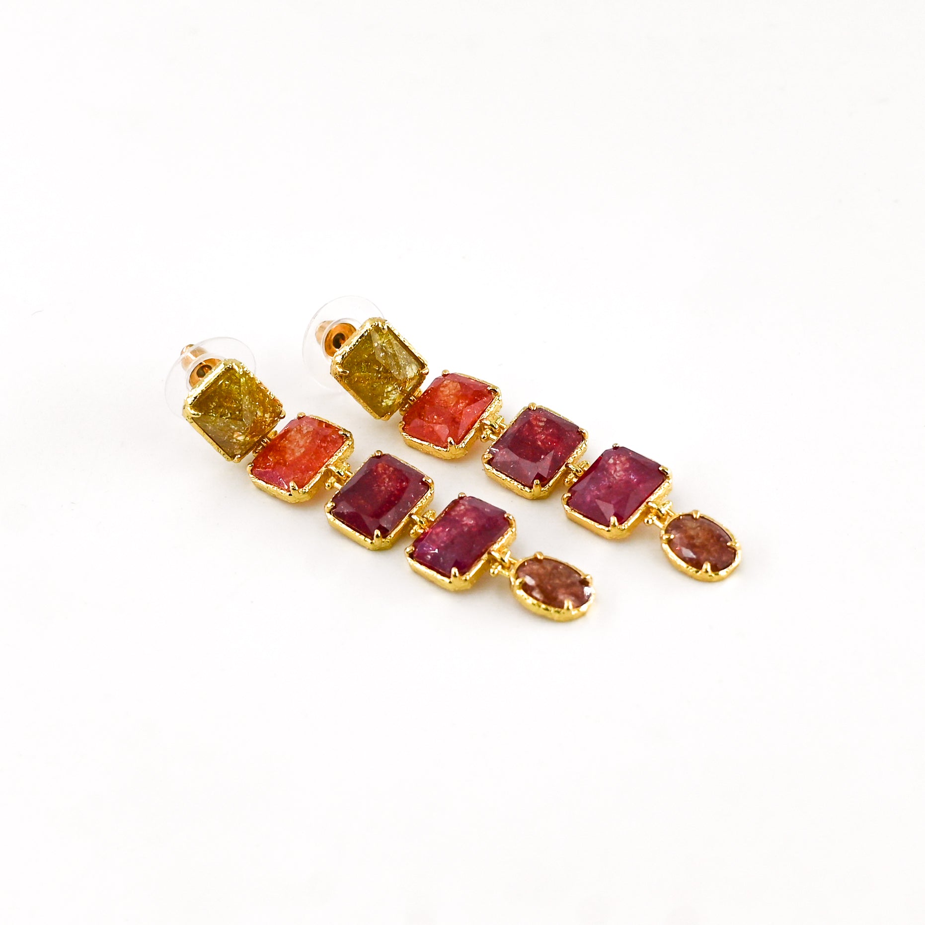 • Boucles d'oreilles pendantes composées de pierres roses et rouges facettées légèrement pailletées, en acier inoxydable