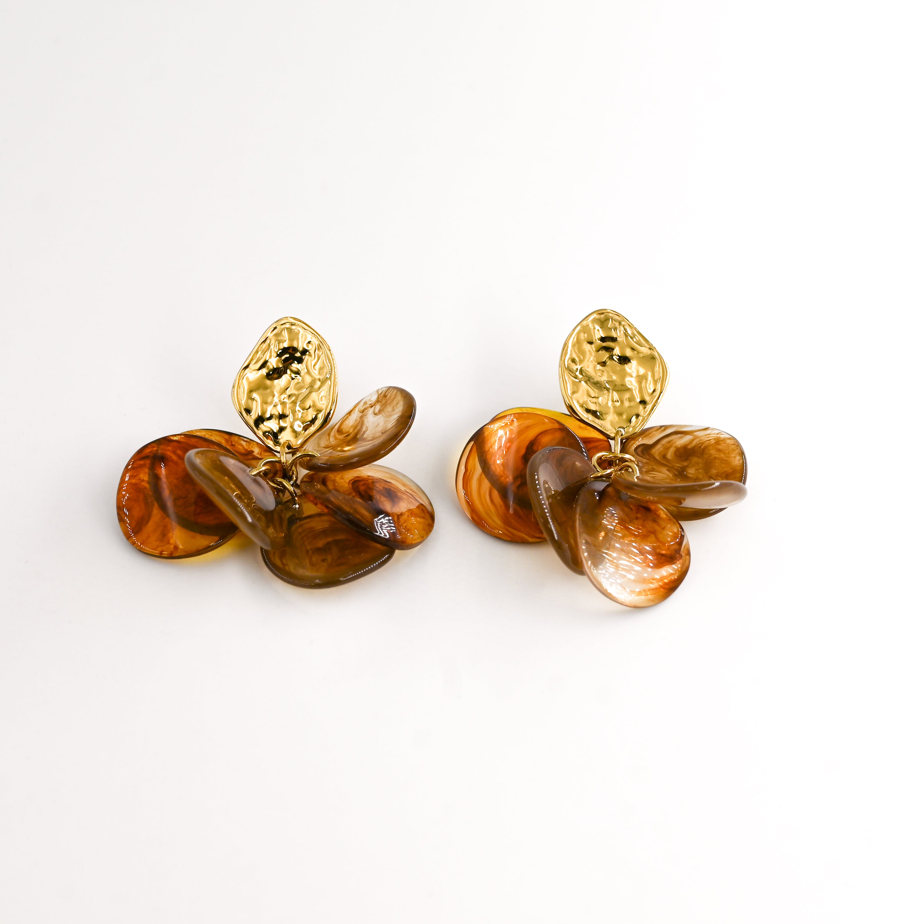 • Boucles d'oreilles pendantes fleurs composées d'un empiècement martelé doré et de pétales marron marbré en acrylique